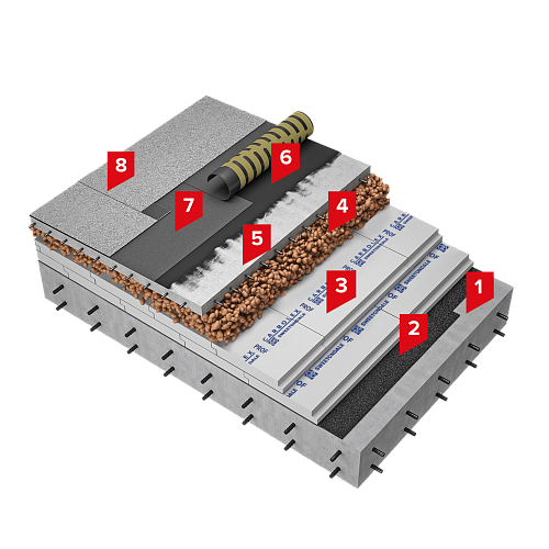 В якості пароізоляції по бетонній основі застосовується матеріал HYDROBASE ULTRA П, що надійно захищає покрівельний пиріг від насичення парою, при цьому стійкий до можливих механічних пошкоджень в умовах монтажу.