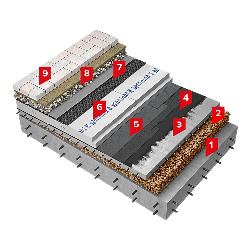 У даній інверсійній системі роль паро- та гідроізоляції виконує бітумно-полімерний матеріал HYDROBASE ELAST ЕПП покладений у два шари. Перед наплавленням нижнього шару поверхню ґрунтують праймером бітумно-полімерним SWEETONDALE.